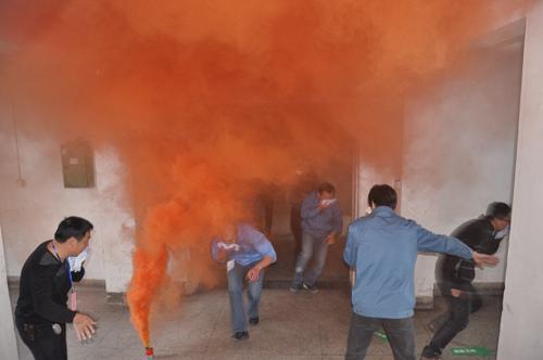 演練開始,信號組在得到演練命令后,立即發(fā)出火警訊號。同時在各個指定點放啟煙霧彈,樓梯道和走廊瞬間濃煙滾滾,各演練組在聽到逃生訊號后,在逃生組長的的組織下,迅速有序地從車間里往車間外疏散,每人用濕毛巾捂住嘴巴,彎腰匍匐前進,按規(guī)定的順序出了車間后分別從中線(沿樓梯道)和南線(沿走廊)繼續(xù)疏散,最后沖出煙區(qū)。救援組的人員跟隨疏散途中搶救了一名受傷人員(專人份演),在煙霧中,他們抬著擔(dān)架將傷員救出,到達指定地點集中,最后一名員工到達指定集合地點的時間是1分17秒。