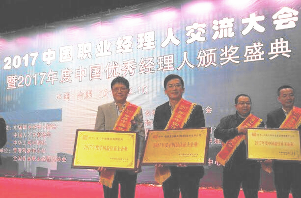 ????2017年12月10-11日, 由中國職業經理人協會、中國人才交流協會、中國工商時報社共同主辦,由管理觀察雜志社、各省職業經理人協會共同承辦的2017中國職業經理人大會在安微合肥隆重召開。會上,公司被授予“2017年度中國最佳雇主企業”稱號。公司副總經理鄭長虹受邀參加此次盛會,并領取了獎牌。