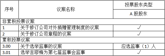 一、股東大會(huì)董事候選人選舉、獨(dú)立董事候選人選舉、監(jiān)事會(huì)候選人選舉作為議案組分別進(jìn)行編號(hào)。投資者應(yīng)針對(duì)各議案組下每位候選人進(jìn)行投票。