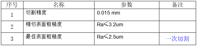 機(jī)床最大線切割速度≥100mm2/min,切割速度能達(dá)到越高越好。精加工(尺寸精度達(dá)到0.015mm,表面粗糙度達(dá)2.5um)時,線切割速度≥20mm2/min。