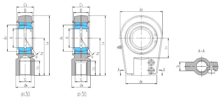 產品特點:帶鎖口桿端關節軸承由桿端體和向心關節軸承GE…ES組裝而成,用擋圈固定,d≤50,桿端體材料是碳鋼,d>50,桿端體材料是球墨鑄鐵,桿端體的內螺紋帶有鎖口,配有螺釘緊固;可通過油杯潤滑。
