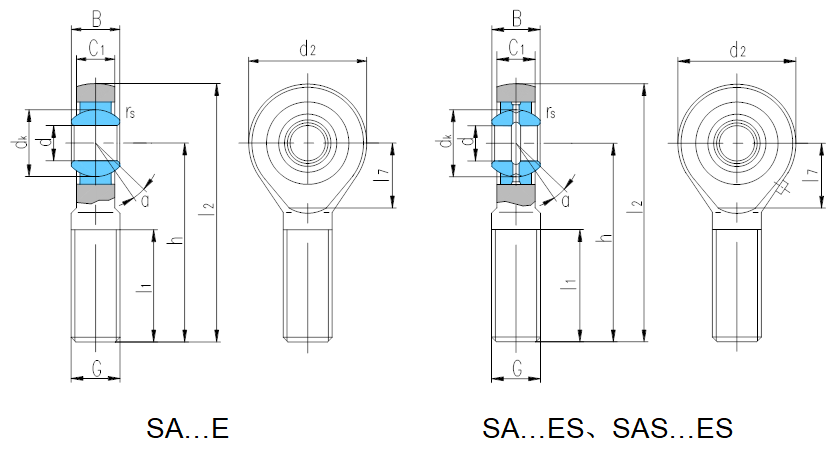 軸 承 型 號 Bearing number 外 形 尺 寸 Dimensions mm 額定載荷 Load ratings kN 重量 Weight ≈kg d B dk C1 max d2 G 6g h l1 min l2 l7 rs min αº ≈ 動載荷 Dynamic 靜載荷 Static SA5E1) 5 6 10 4.5 21 M5 36 16 46.5 11.5 0.3 13 3.4 3.9 0.015 SA6E1) 6 6 10 4.5 21 M6 36 16 46.5 11.5 0.3 13 3.4 5.5 0.016 SA8E1) 8 8 13 6.5 24 M8 42 21 54 13 0.3 15 5.5 10 0.026 SA10E1) 10 9 16 7.5 29 M10 48 26 62.5 15.5 0.3 12 8.1 16 0.050 SA12E1) 12 10 18 8.5 34 M12 54 28 71 18 0.3 10 10 23 0.068 SA15ES2) 15 12 22 10.5 40 M14 63 34 83 21 0.3 8 16 32 0.120 SA17ES2) 17 14 25 11.5 46 M16 69 36 92 24 0.3 10 21 44 0.190 SA20ES2) 20 16 29 13.5 53 M20×1.5 78 43 104.5 25.5 0.3 9 30 60 0.300 SA25ES 25 20 35.5 18 64 M24×2 94 53 126 31 0.6 7 48 83 0.555 SA30ES 30 22 40.7 20 73 M30×2 110 65 146.5 35.5 0.6 6 62 110 0.875 SA35ES 35 25 47 22 82 M36×3 140 82 181 41 0.6 6 79 146 1.42 SA40ES 40 28 53 24 92 M39×3 150 86 196 47 0.6 7 99 180 1.85 SAS40ES 40 28 53 23 92 M42×3 145 86 191 47 0.6 7 99 180 2.04 SA45ES 45 32 60 28 102 M42×3 163 92 214 52 0.6 7 127 240 2.49 SAS45ES 45 32 60 27 102 M45×3 165 95 216 52 0.6 7 127 240 2.74 SA50ES 50 35 66 31 112 M45×3 185 104 241 60 0.6 6 156 290 3.58 SAS50ES 50 35 66 30 112 M52×3 195 110 251 60 0.6 6 156 290 4.07 SA60ES 60 44 80 39 135 M52×3 210 115 277.5 75.5 1.0 6 245 450 5.89 SAS60ES 60 44 80 38 135 M60×4 225 120 292.5 75.5 1.0 6 245 450 6.79 SA70ES 70 49 92 43 160 M56×4 235 125 315 95 1.0 6 313 610 8.51 SAS70ES 70 59 92 42 160 M72×4 265 132 345 95 1.0 6 313 610 11.2 SA80ES 80 55 105 48 180 M64×4 270 140 360 105.5 1.0 6 400 750 12.3 SAS80ES 80 55 105 47 180 M80×4 295 147 385 105.5 1.0 6 400 750 15.3
