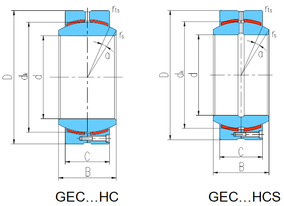 產品特點:外圈徑向分為兩半,用螺釘鎖緊,材料為碳鋼,磷化,球面襯有PTFE復合材料;內圈材料為軸承鋼,淬火,球面鍍硬鉻,型號后置代號加S,表示內圈有潤滑油槽油孔。