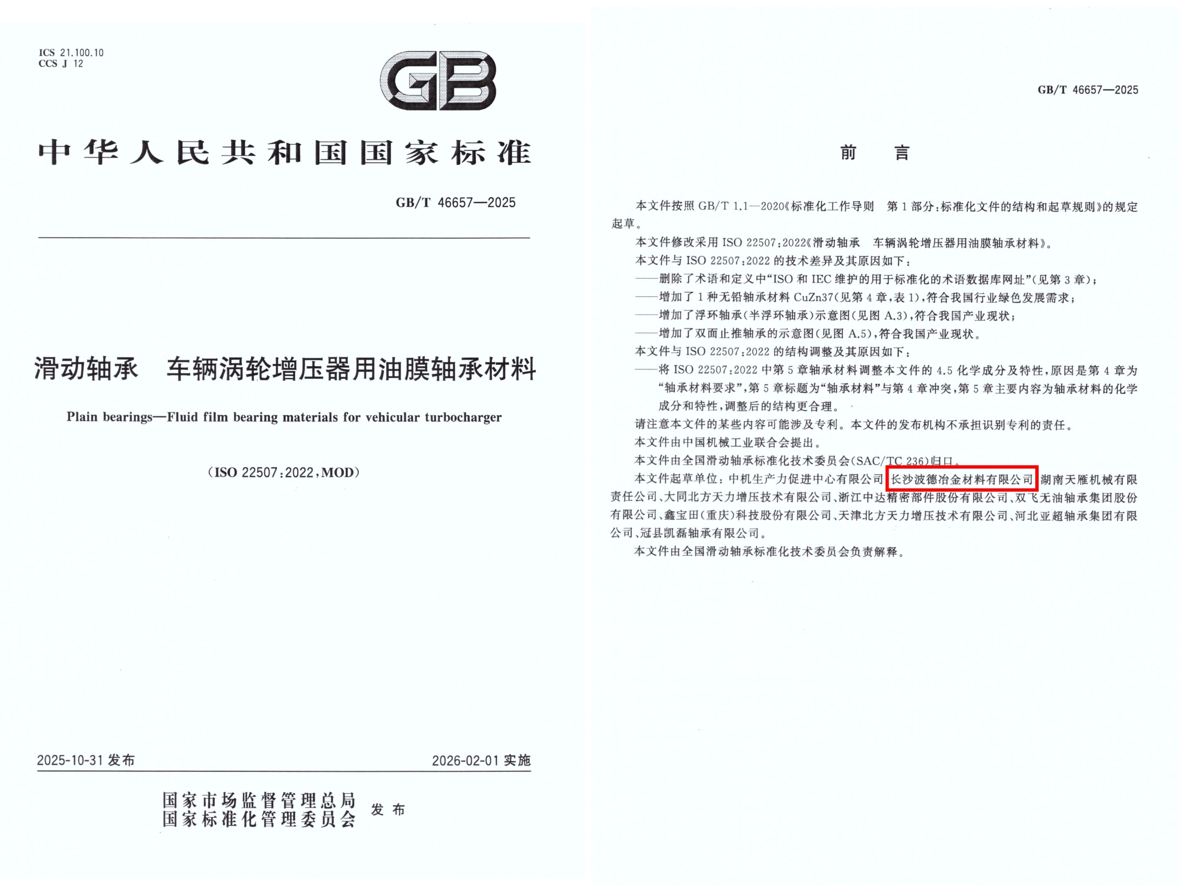 國家市場監(jiān)督管理總局、國家標(biāo)準(zhǔn)化管理委員會正式批準(zhǔn)發(fā)布的國家推薦性標(biāo)準(zhǔn)GB/T 46657-2025《滑動軸承 車輛渦輪增壓器用油膜軸承材料》將于近期正式實施,龍軸集團權(quán)屬企業(yè)長沙波德公司作為主要起草單位(排名第二),聯(lián)合國內(nèi)車輛渦輪增壓器及油膜軸承材料相關(guān)生產(chǎn)企業(yè)共同起草該標(biāo)準(zhǔn)。