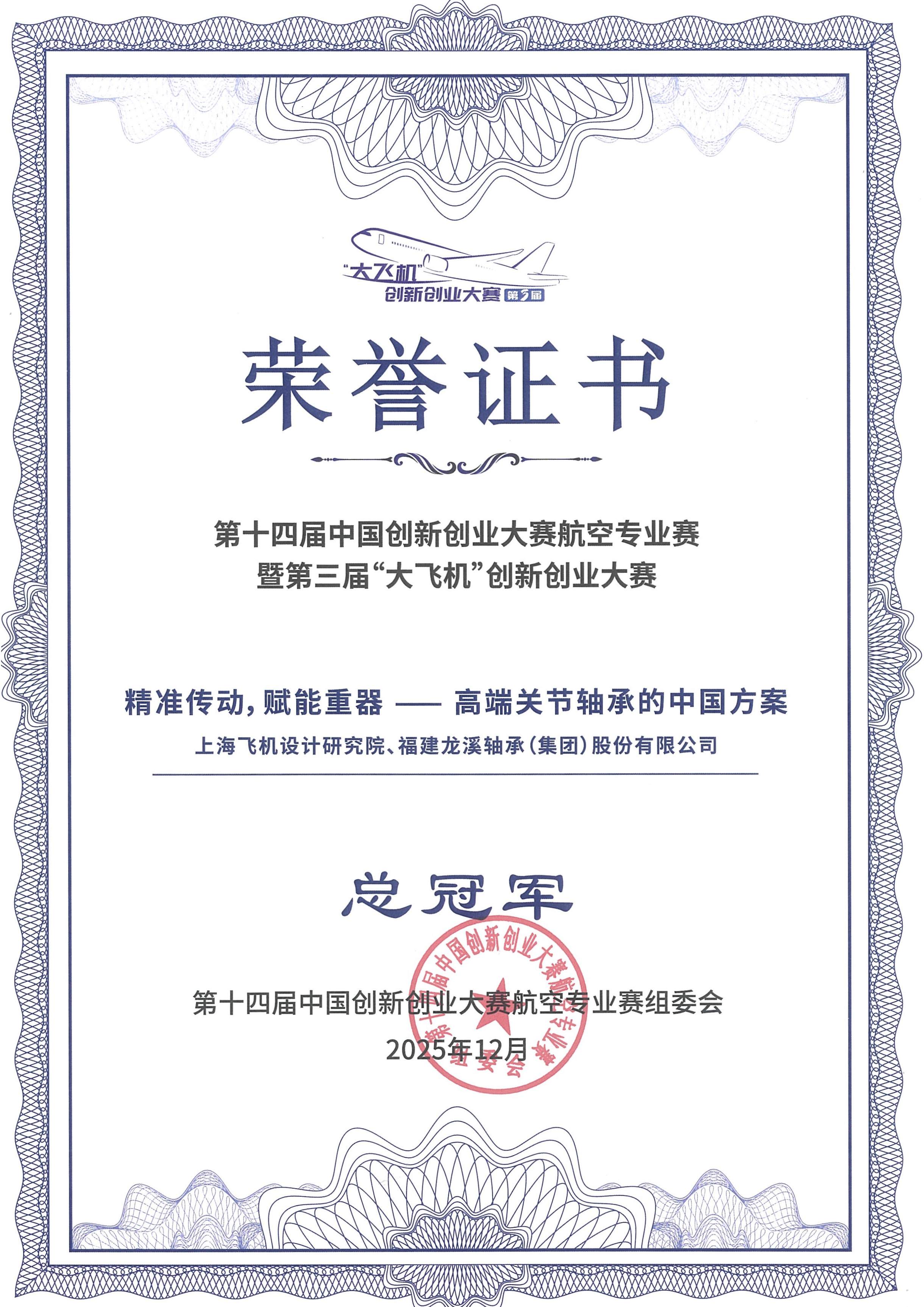 2025年12月,在第十四屆中國創(chuàng)新創(chuàng)業(yè)大賽航空專業(yè)賽暨第三屆“大飛機”創(chuàng)新創(chuàng)業(yè)大賽總決賽上,公司《精準(zhǔn)傳動,賦能重器——高端關(guān)節(jié)軸承的中國方案》項目從全國333個項目中脫穎而出,問鼎總冠軍。公司深度融入大飛機產(chǎn)業(yè)鏈體系,加速推進自主可控的全國產(chǎn)化替代,助力大飛機產(chǎn)業(yè)高飛遠航、布局未來。