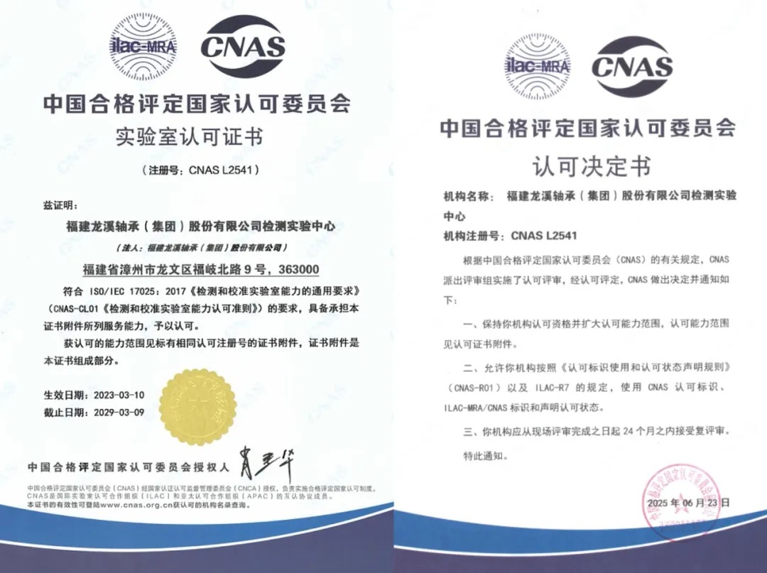 公司檢測實驗中心順利通過中國合格評定國家認(rèn)可委員會(CNAS)擴項評審,涉及43項標(biāo)準(zhǔn),包含116個項目參數(shù),新增9項標(biāo)準(zhǔn),獲得認(rèn)可決定書和實驗室認(rèn)可證書,標(biāo)志著公司在軸承可靠性驗證、材料微觀分析等核心技術(shù)領(lǐng)域?qū)崿F(xiàn)重大突破,已構(gòu)建覆蓋從材料到產(chǎn)品的檢測服務(wù)體系,檢測能力達到國際先進水平。