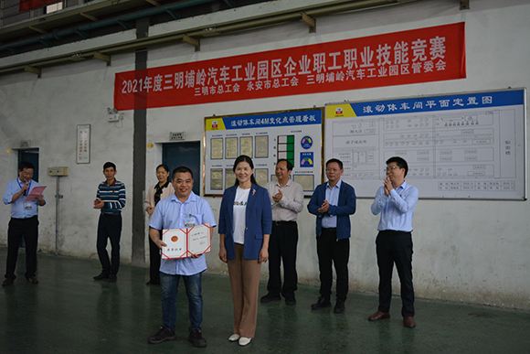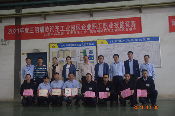 ▲三明市總工會、永安市總工會、三明埔嶺汽車工業園區管委會領導及龍軸集團永軸公司領導班子與獲獎選手合影留念