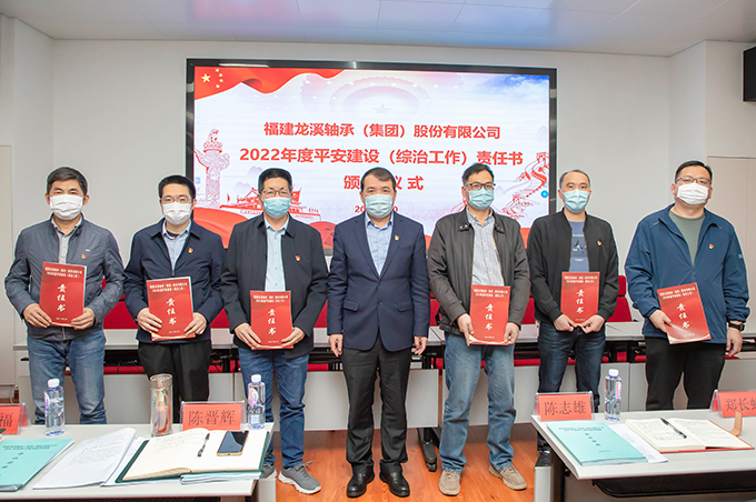2022年3月30日,龍軸集團舉行平安建設(綜治工作)責任書簽訂頒發儀式。集團黨委書記、董事長陳晉輝分別與在漳權屬企業負責人簽訂了《2022年平安建設(綜治工作)責任書》,集團創建“平安單位”分管領導劉明福分別與集團直屬部室、車間負責人簽訂了《2022年平安建設(綜治工作)責任書》。陳晉輝向在漳權屬企業、集團直屬部室、車間負責人頒發了責任書。