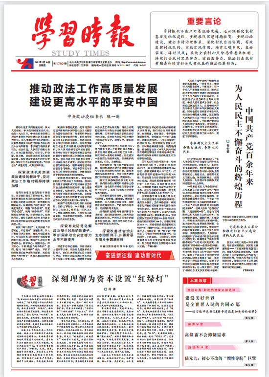 3月16日,學習時報頭版頭條刊發(fā)中央政法委秘書長陳一新關(guān)于推動政法工作高質(zhì)量發(fā)展建設(shè)更高水平的平安中國的署名文章,從探索政法機關(guān)加強政治建設(shè)的新路子、探索有效防范化解政治安全風險的新路子、探索改善社會治安生態(tài)的新路子、探索加快社會治理現(xiàn)代化的新路子、探索完善中國特色社會主義政法制度體系的新路子、探索政法服務(wù)黨和國家工作大局的新路子、探索打贏政法領(lǐng)域意識形態(tài)斗爭主動仗的新路子、探索推進政法戰(zhàn)線自我革命的新路子等八個方面進行了系統(tǒng)闡述。